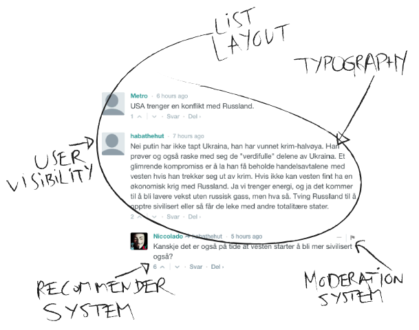 In this thesis, I will study the designs of commenting sections in online magazines and newspapers. These are interfaces consisting of a variety of designed choices, such as layout, typography, moderation system and a recommender system that helps us to decide which comments to read first. Within each of these choices there are many possibilities that affects our use experience, whereas few of them are explored in research. In my research, I seek to study and visualize concept designs for the holistic use experience of these choices, with emphasis on enhancing the expressive possibilities and engagement.